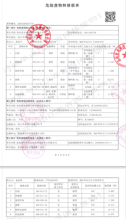 2024年04月11日,bw必威西汉姆联委托危险废弃物运输单位张家港市港锡公铁水联运有限公司、处置单位张家港市华瑞危险废物处理中心有限公司转移及处置危险废弃物,所转移及处置的危险废弃物分别为:滤渣(264-011-12)0.515吨、废活性炭(900-039-49)1.209吨、污泥(264-012-12)4.885吨、浓缩液(264-011-12)3.316吨、实验废物(900-047-49)0.075吨、颜料包装物(900-041-49)10.716吨,所处置及转移的危险废弃物经过《江苏省生态环境厅江苏省污染源“一企一档”管理系统》申报审批通过,转移及处置量在危险废弃物管理计划内。