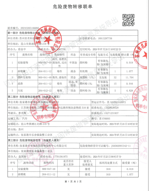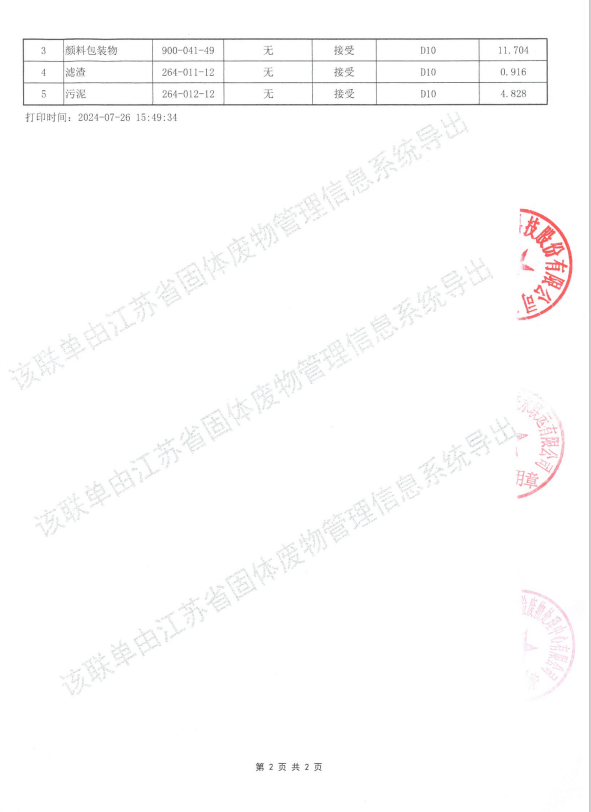 2024年07月24日,bw必威西汉姆联委托危险废弃物运输单位张家港市港锡公铁水联运有限公司、处置单位张家港市华瑞危险废物处理中心有限公司转移及处置危险废弃物,所转移及处置的危险废弃物分别为:滤渣(264-011-12)0.916吨、污泥(264-012-12)4.828吨、浓缩液(264-011-12)1.077吨、实验废物(900-047-49)0.019吨、颜料包装物(900-041-49)11.704吨,所处置及转移的危险废弃物经过《江苏省生态环境厅江苏省污染源“一企一档”管理系统》申报审批通过,转移及处置量在危险废弃物管理计划内。
