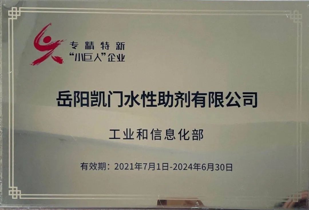 为深入贯彻习近平总书记关于“培育一批‘专精特新’中小企业”的重要指示精神,日前,工业和信息化部开展了第六批专精特新“小巨人”企业培育和第三批专精特新“小巨人”企业复核工作,并公布了相关企业名单。其中,岳阳凯门水性助剂有限公司顺利通过第三批专精特新“小巨人”企业复核!