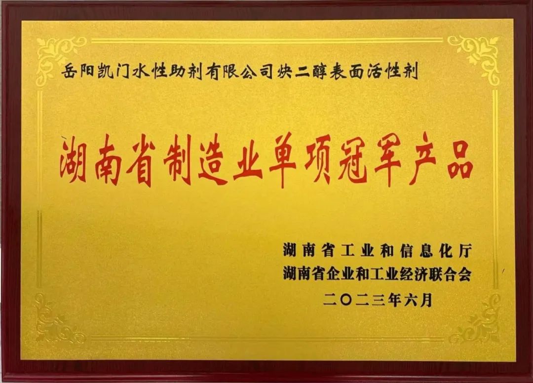 2021年,凯门助剂荣获国家级专精特新“小巨人”企业荣誉称号,始终专注于助剂领域的深耕细作,致力于为客户提供高品质、高性能的助剂产品,不断推动技术创新和产品升级,成功研发出多项核心技术,在市场上取得了广泛应用和高度认可。2023年,公司研发的炔二醇表面活性剂荣获湖南省制造业单项冠军产品。