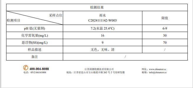 2024年11月12日,bw必威西汉姆联委托第三方检测公司江苏国测检测技术有限公司于bw必威西汉姆联厂区北侧雨水排放口取雨水水样进行检测,监测指标为COD(化学需氧量)、悬浮物和PH值,检测结果:COD:16mg/l,悬浮物:9mg/l ,PH:7.2,水质结果判定符合《地表水环境质量标准》标准中表1中IV类标准,COD:30 mg/l,PH值范围:6-9,悬浮物:70 mg/l。