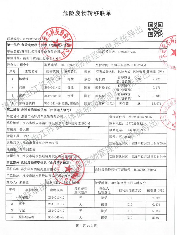 2024年12月25日,bw必威西汉姆联委托危险废弃物运输单位淮安交运危货运输有限公司、处置单位张家港市华瑞危险废物处理中心有限公司转移及处置危险废弃物,所转移及处置的危险废弃物分别为:滤渣(264-011-12)0.171吨、浓缩液(264-011-12)2.223吨、污泥(264-012-12)5.105吨、颜料包装物(900-041-49)15.971吨,所处置及转移的危险废弃物经过《江苏省生态环境厅江苏省污染源“一企一档”管理系统》申报审批通过,转移及处置量在危险废弃物管理计划内。