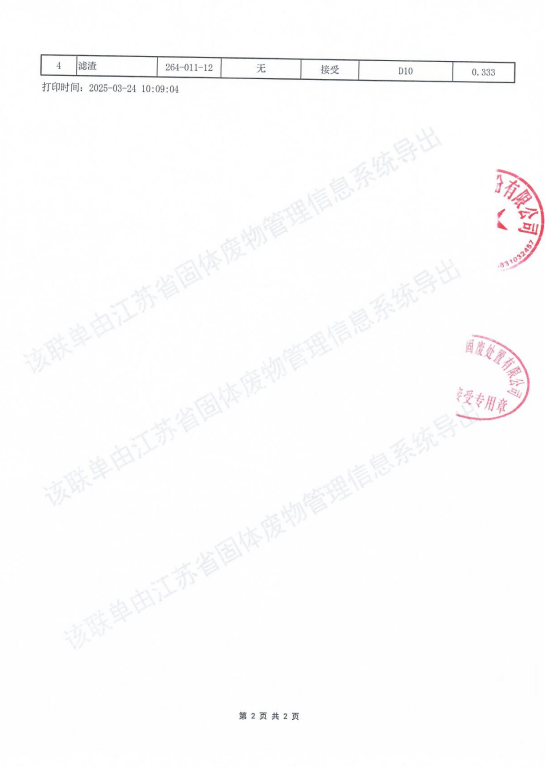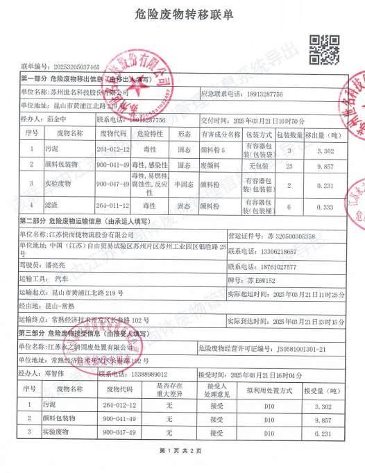 2025年3月21日,bw必威西汉姆联委托危险废弃物运输单位江苏快而捷物流股份有限公司、处置单位江苏永之清固废处置有限公司转移及处置危险废弃物,所转移及处置的危险废弃物分别为:滤渣(264-011-12)0.333吨、污泥(264-012-12)3.302吨、颜料包装物(900-041-49)9.857吨、实验废物(900-047-49)0.231,所处置及转移的危险废弃物经过《江苏省生态环境厅江苏省污染源“一企一档”管理系统》申报审批通过,转移及处置量在危险废弃物管理计划内。