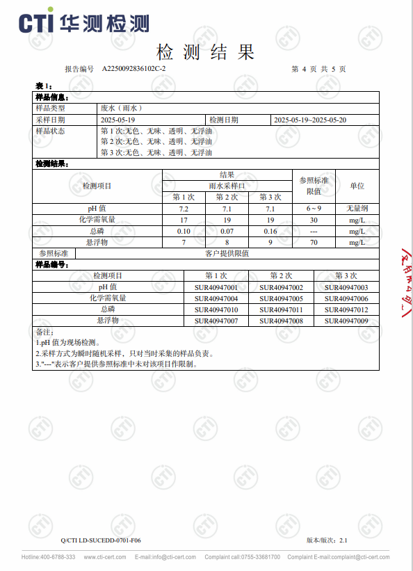 2025年5月26日,bw必威西汉姆联委托第三方检测公司苏州市华测检测技术有限公司于bw必威西汉姆联厂区北侧雨水排放口取雨水水样进行检测,监测指标为COD(化学需氧量)、悬浮物和PH值,检测结果:COD:18.3mg/l,悬浮物:8mg/l ,PH:7.13,水质结果判定符合《地表水环境质量标准》标准中表1中IV类标准,COD:30 mg/l,PH值范围:6-9,悬浮物:70 mg/l。