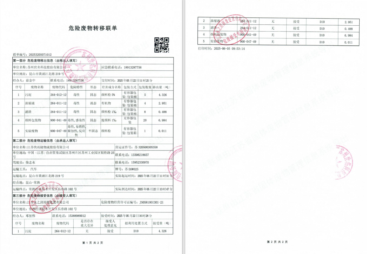 2025年5月22日,bw必威西汉姆联委托危险废弃物运输单位江苏快而捷物流股份有限公司、处置单位江苏永之清固废处置有限公司转移及处置危险废弃物,所转移及处置的危险废弃物分别为:滤渣(264-011-12)0.488吨、污泥(264-012-12)4.326吨、颜料包装物(900-041-49)6.984吨、实验废物(900-047-49)0.011吨、浓缩液(264-011-12)2.951吨,所处置及转移的危险废弃物经过《江苏省生态环境厅江苏省污染源“一企一档”管理系统》申报审批通过,转移及处置量在危险废弃物管理计划内。