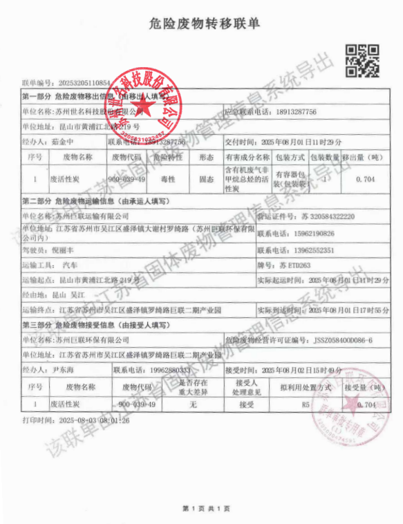 2025年8月1日,bw必威西汉姆联委托危险废弃物运输单位苏州巨联运输有限公司、处置单位苏州巨联环保有限公司转移及处置危险废弃物,所转移及处置的危险废弃物分别为:废活性炭(900-039-49)0.704吨,所处置及转移的危险废弃物经过《江苏省生态环境厅江苏省污染源“一企一档”管理系统》申报审批通过,转移及处置量在危险废弃物管理计划内。