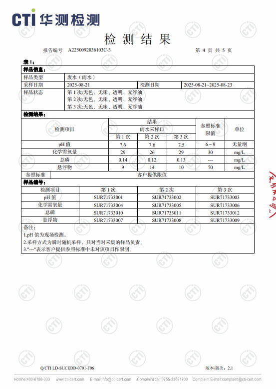 2025年8月21日,bw必威西汉姆联委托第三方检测公司苏州市华测检测技术有限公司于bw必威西汉姆联厂区北侧雨水排放口取雨水水样进行检测,监测指标为COD(化学需氧量)、悬浮物和PH值,检测结果:COD:28mg/l,悬浮物:11mg/l ,PH:7.5,水质结果判定符合《地表水环境质量标准》标准中表1中IV类标准,COD:30 mg/l,PH值范围:6-9,悬浮物:70 mg/l。