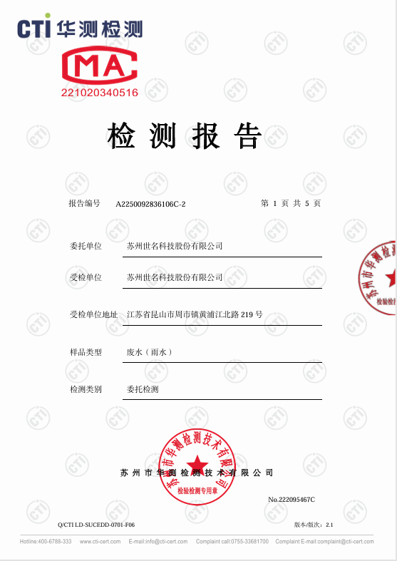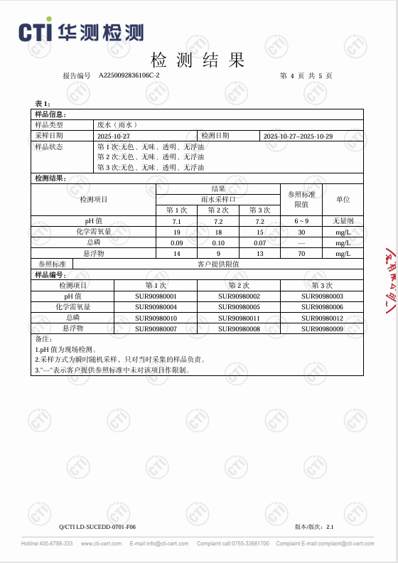 2025年10月27日,bw必威西汉姆联委托第三方检测公司苏州市华测检测技术有限公司于bw必威西汉姆联厂区北侧雨水排放口取雨水水样进行检测,监测指标为COD(化学需氧量)、悬浮物和PH值,检测结果:COD:17.3mg/l,悬浮物:12mg/l ,PH:7.16,水质结果判定符合《地表水环境质量标准》标准中表1中IV类标准,COD:30 mg/l,PH值范围:6-9,悬浮物:70 mg/l。