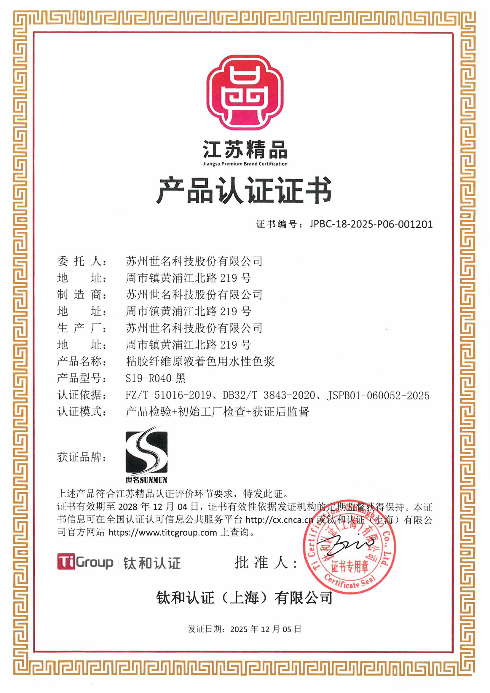 我司“粘胶纤维原液着色用水性色浆”荣获2025年度“江苏精品”认证