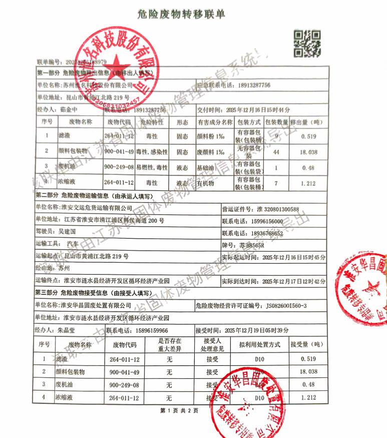 2025年12月16日,bw必威西汉姆联委托危险废弃物运输单位淮安交运危货有限公司、处置单位淮安华昌处置有限公司转移及处置危险废弃物,所转移及处置的危险废弃物分别为:浓缩液(264-011-12)1.212吨、滤渣(264-011-12)0.519吨、颜料包装物(900-041-49)18.038吨、废机油(900-049-08)0.48吨,所处置及转移的危险废弃物经过《江苏省生态环境厅江苏省污染源“一企一档”管理系统》申报审批通过,转移及处置量在危险废弃物管理计划内。
