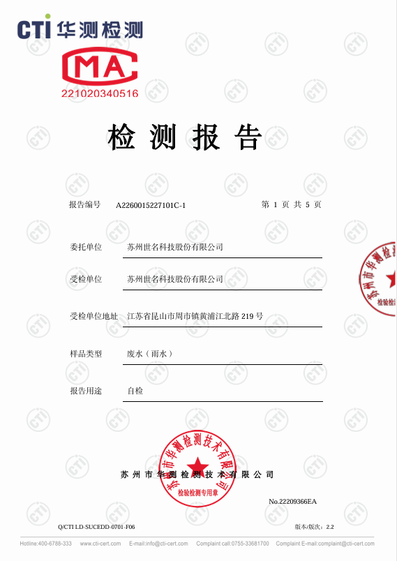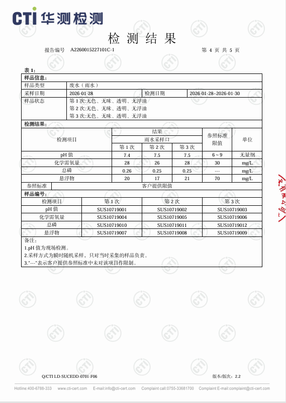 2026年1月30日,bw必威西汉姆联委托第三方检测公司苏州市华测检测技术有限公司于bw必威西汉姆联厂区北侧雨水排放口取雨水水样进行检测,监测指标为COD(化学需氧量)、悬浮物和PH值,检测结果:COD:27.3mg/l,悬浮物:19.3mg/l ,PH:7.4,水质结果判定符合《地表水环境质量标准》标准中表1中IV类标准,COD:30 mg/l,PH值范围:6-9,悬浮物:70 mg/l。