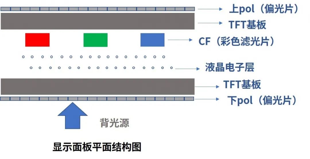 TFT-LCD液晶显示器是通过两块偏光栅栏角度相互垂直时光线完全无法通过的特性,运用上下两片栅栏之间互垂直的偏光板间充满的液晶,以电场控制液晶分支旋转,改变光的行进方向,从而形成不同电场大小,呈现不同颜色。