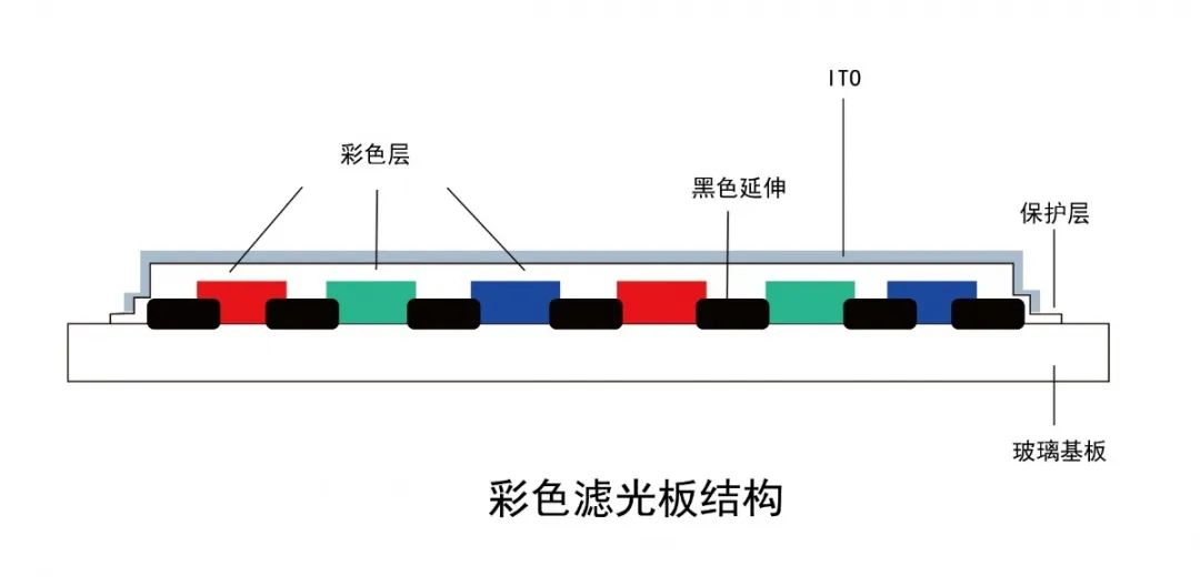 彩色滤光片基本结构是由玻璃基板(Glass Substrate),黑色矩阵(Black Matrix),彩色层(Color Layer),保护层(Over Coat),ITO导电膜组成。彩色光刻胶层 RGB(分别代表红、绿、蓝三原色)排列在玻璃基板上,为提高不同颜色的对比度并防止不同颜色体之间背景光的影响,RGB 被黑色光刻胶分隔开。有了这样的构造,使用时,液晶开关控制透过不同颜色体的光强,画素点处三种原色光进一步混合产生不同色光,众多画素点组成人眼可见的图像。