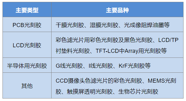 光刻胶(Photoresist)又称光致抗蚀剂,是指通过紫外光、电子束、离子束、X射线等照射或辐射,其溶解度发生变化的耐蚀剂刻薄膜材料,它是由感光树脂、增感剂和溶剂三种主要成分组成的对光敏感的混合液体,在光刻工艺过程中,用作抗腐蚀涂层材料。按照下游应用领域不同,分类如下: