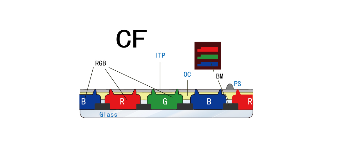 TFT-LCD显示屏所呈现的色彩变化是通过屏幕中厚度只有2μm的一层彩色滤光片(color filter 简称CF)实现,而这层薄片颜色的产生则由光刻胶来完成。