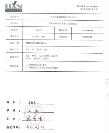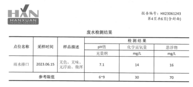 2023年07月30日,bw必威西汉姆联委托第三方检测公司江苏汉宣检测科技有限公司于bw必威西汉姆联厂区北侧雨水排放口取雨水水样进行检测,监测指标为COD(化学需氧量)、悬浮物和PH值,检测结果:COD:14mg/l,悬浮物:16mg/l ,PH:7.1,水质结果判定符合《地表水环境质量标准》标准中表1中IV类标准,COD:30 mg/l,PH值范围:6-9。