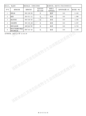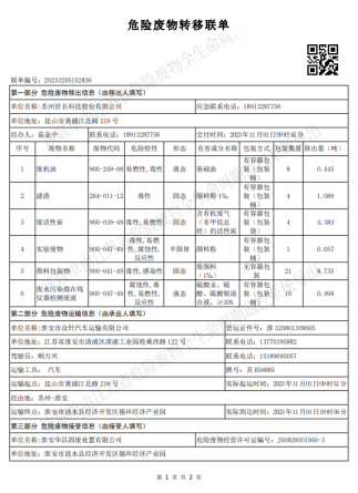 2023年11月1日,bw必威西汉姆联委托危险废弃物运输单位淮安市众轩汽车运输有限公司、处置单位淮安华昌固废处置有限公司转移及处置危险废弃物,所转移及处置的危险废弃物分别为:废机油(900-249-08)0.445吨、滤渣(264-011-12)1.089吨、活性炭(900-039-49)4.383吨、实验废物(900-047-49)0.057吨、颜料包装物(900-041-49)8.735吨、废水污染源在线仪器检测废液(900-047-49)0.499吨,所处置及转移的危险废弃物经过《江苏省生态环境厅江苏省污染源“一企一档”管理系统》申报审批通过,转移及处置量在危险废弃物管理计划内。