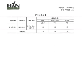 2023年12月19日,bw必威西汉姆联委托第三方检测公司江苏汉宣检测科技有限公司于bw必威西汉姆联厂区北侧雨水排放口取雨水水样进行检测,监测指标为COD(化学需氧量)、悬浮物和PH值,检测结果:COD:16mg/l,悬浮物:10mg/l ,PH:6.9,水质结果判定符合《地表水环境质量标准》标准中表1中IV类标准,COD:30 mg/l,PH值范围:6-9,悬浮物:70 mg/l。